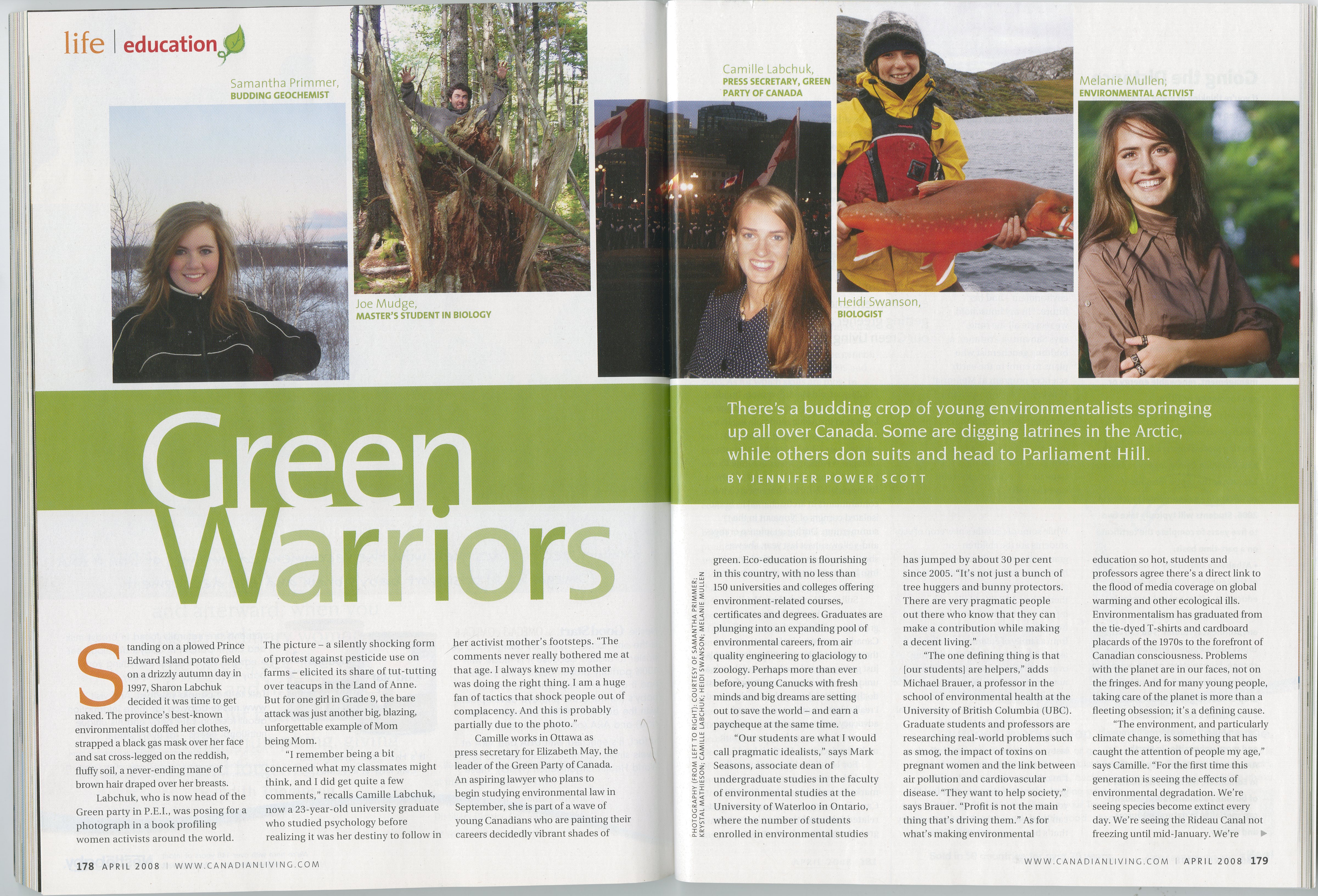 Green Warriors features Melanie Mullen as a budding young environmental activist in the center fold of the CANADIAN LIVING Magazine April 2008